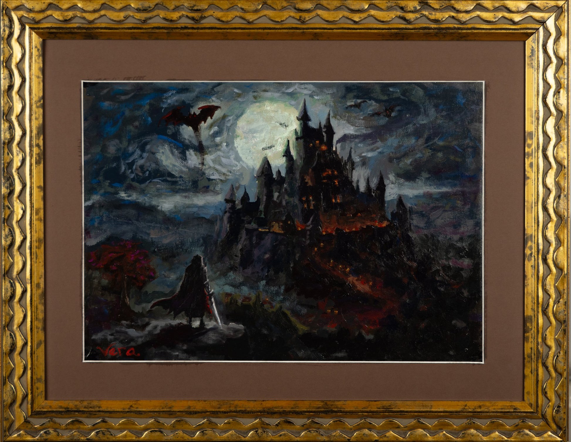 “Cacciatore di Vampiri” incarna un romanticismo cupo, imbevuto del linguaggio visivo del racconto gotico. La composizione si concentra su un castello silhouette drammaticamente, le sue torri che graffiano un cielo luminoso e turbolento. I blu profondi e i grigi carbone dominano, punteggiati da sottili scintille di cremisi che suggeriscono un'energia nascosta all'interno della struttura. Una figura solitaria, resa quasi nell'ombra, rimane in veglia, suggerendo una narrazione di resistenza contro una minaccia invisibile. Il lavoro a strati dell'artista crea un senso palpabile di atmosfera—un vento gelido sembra avvolgere la scena, portando con sé il peso di secoli. Questo non è un ritratto di terrore, ma uno studio sulla bellezza malinconica dell'isolamento e sul potere duraturo del mito.
