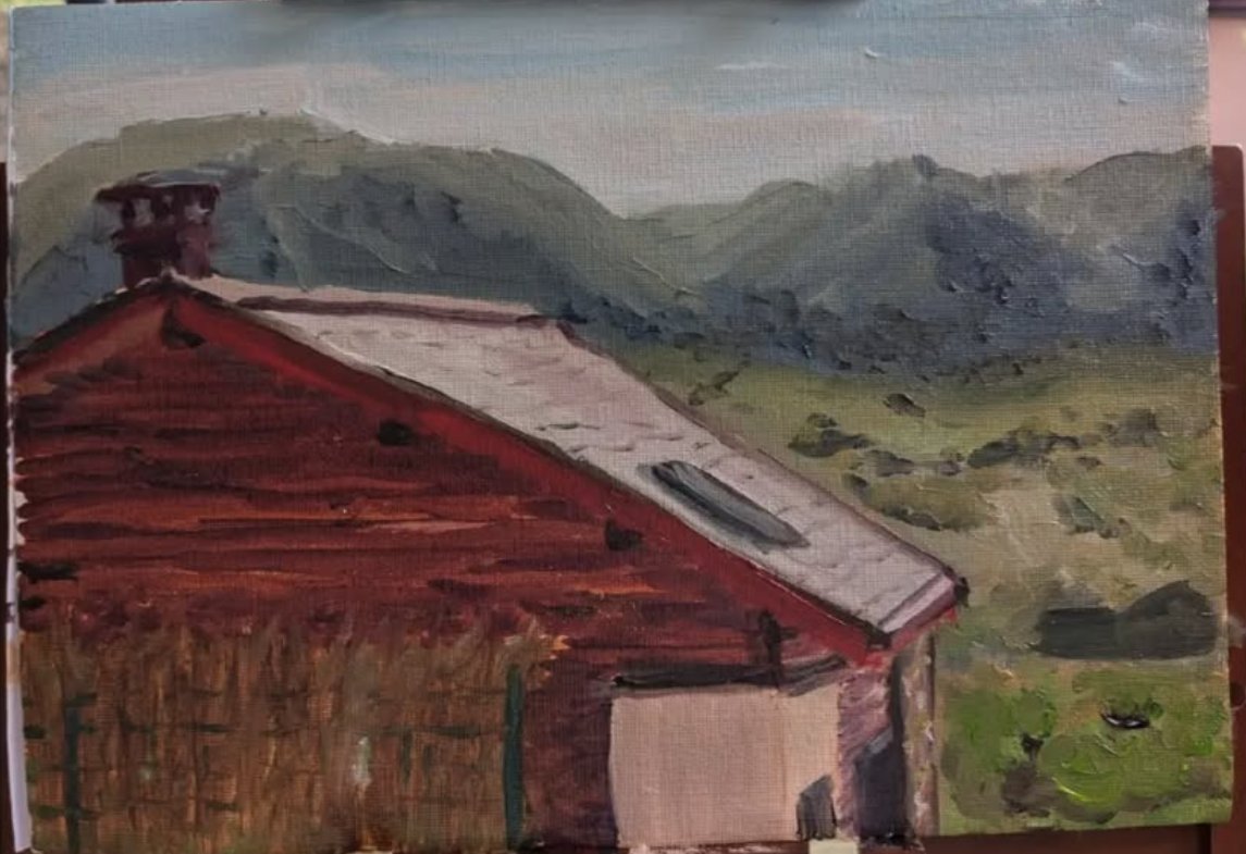 “Font-Romeu Views” captures a fleeting moment of domesticity framed by the enduring presence of the Pyrenees. The composition centers on a steeply pitched roof, its terracotta warmth offset by cool, silvery light playing across the tiles. Thick, deliberate brushwork animates the surface, lending a tactile quality to the architecture and a sense of immediacy to the vista beyond. Layers of verdant green suggest rolling hills and distant woodlands, rendered with a restrained palette that emphasizes atmosphere over detail. A quiet intimacy pervades the scene, hinting at lives lived within and observed from this vantage point. The work evokes a feeling of cool air and muted sunlight, a stillness broken only by the implied rhythm of the landscape. It is a study in the subtle poetry of everyday life, a momentary pause within a grander, natural setting.