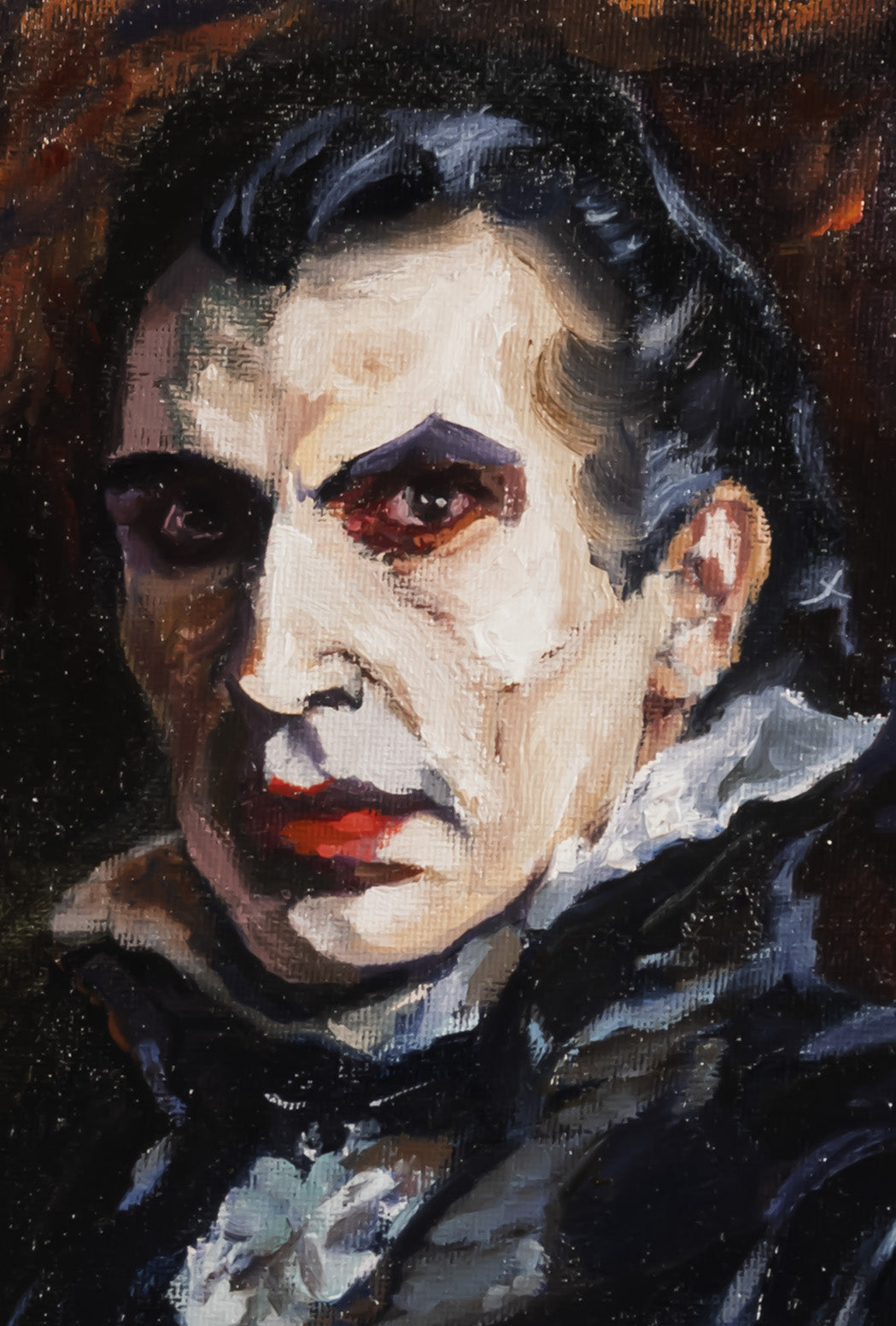 “Vampire” dwells in shadow, a portrait steeped in the weight of centuries. The figure, rendered with bold, sweeping strokes, emerges from a bruised and turbulent darkness, a study in contrasts between pallor and deep, enveloping blues. A crimson trace—a lingering echo—suggests a recent intimacy, a haunting presence just beyond the frame. The artist masterfully uses texture to convey not just likeness, but a psychological state—a weary nobility laced with a palpable melancholy. Light, fractured and restrained, barely illuminates the subject’s gaze, leaving the viewer to confront a quiet, internal drama. This is not a spectacle of fear, but an intimate glimpse into a solitary existence, a portrait of a being both captivating and irrevocably marked by time.